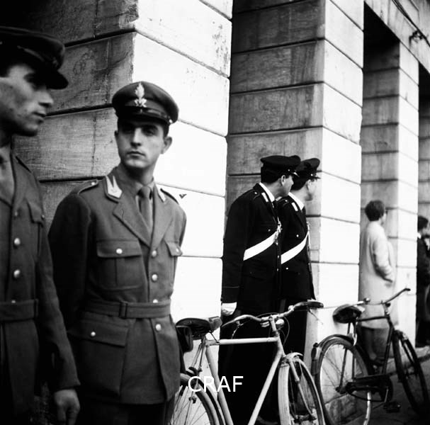Due polizziotti e due carabinieri accanto ad un porticato di un palazzo alla...