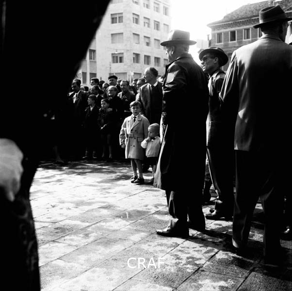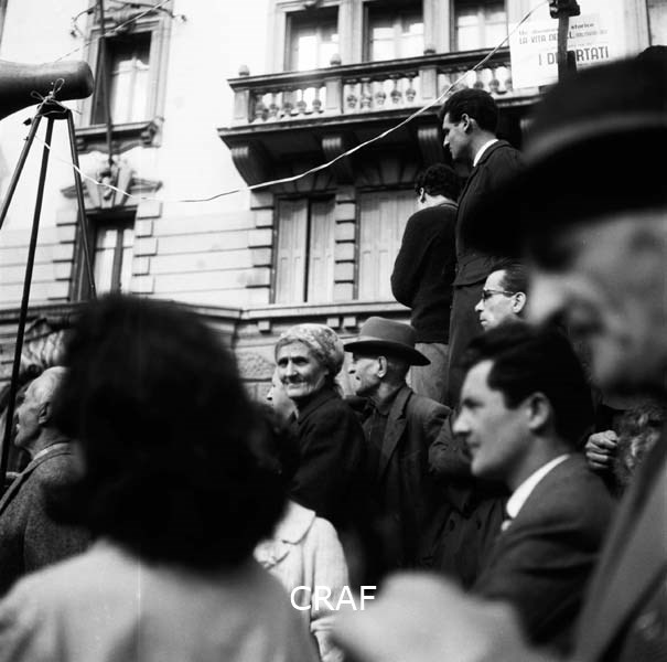 Gruppo di persone in una piazza alla manifestazione di Udine (1956-1957 ca.);...