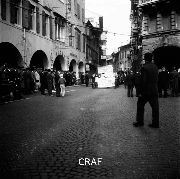 Arrivo dei manifestanti nella piazza udinese (1956-1957 ca.); folla di persone...