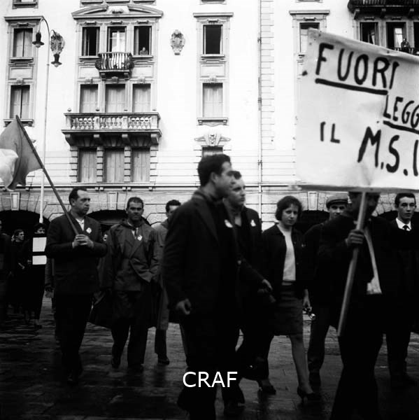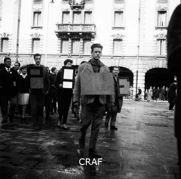 Manifestanti a Udine (1956-1957 ca.): un ragazzo in primo piano ha appeso al...