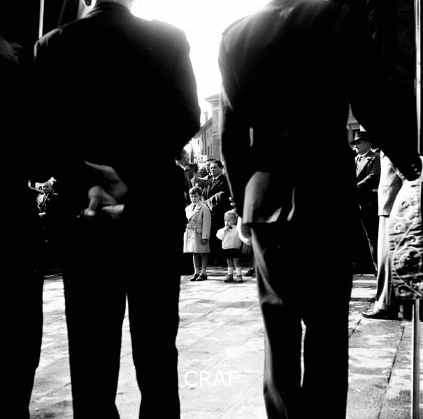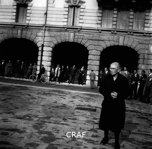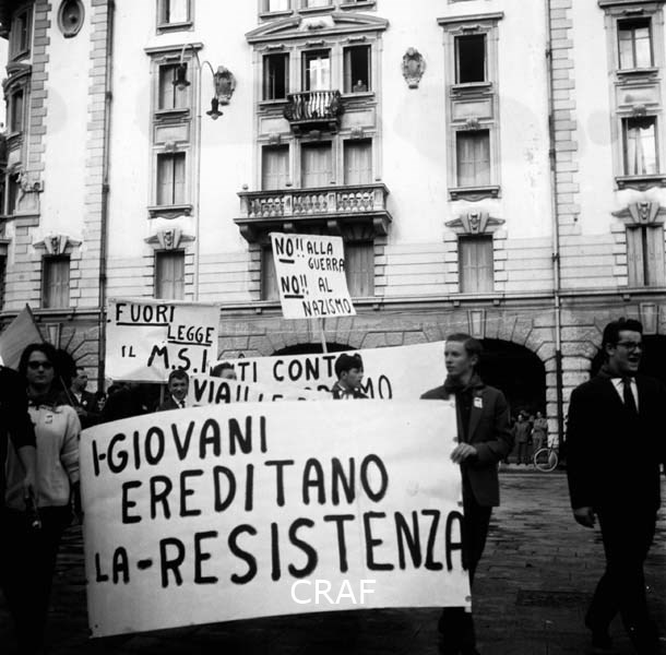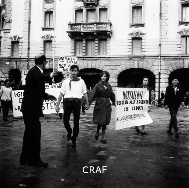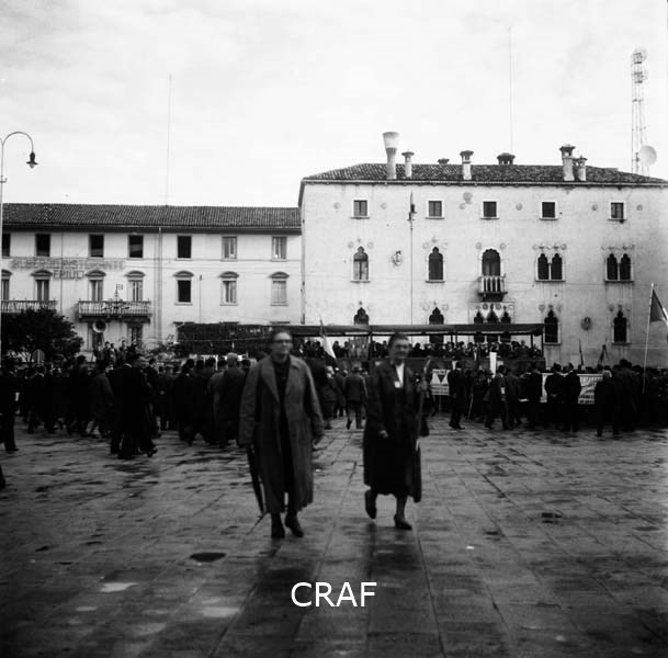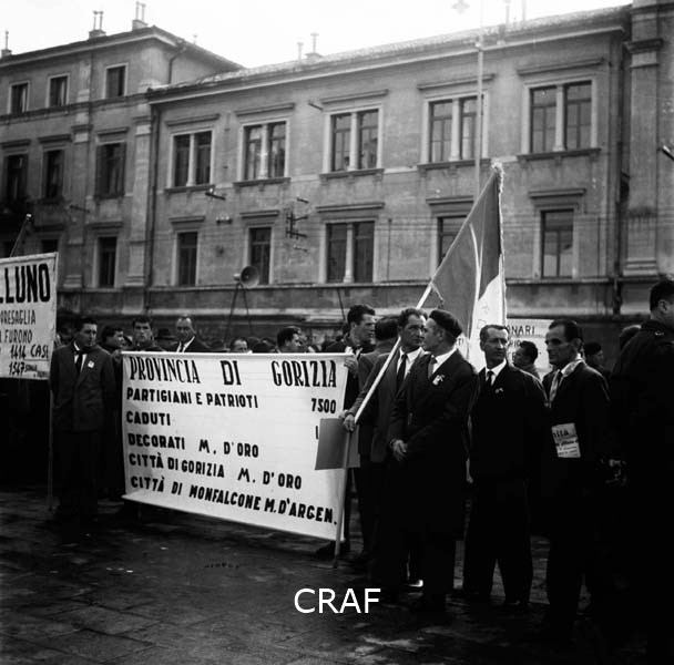 Gruppi di ragazzi alla manifestazione di Udine (1956-1957 ca.); il manifesto in...