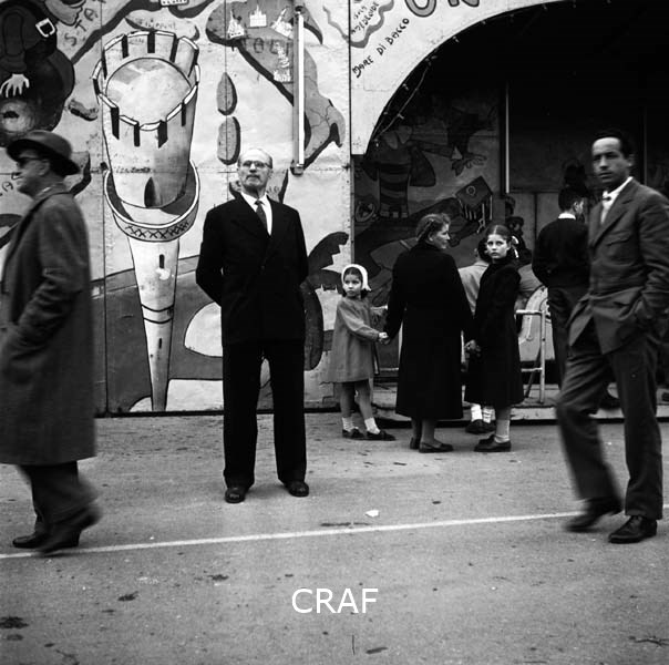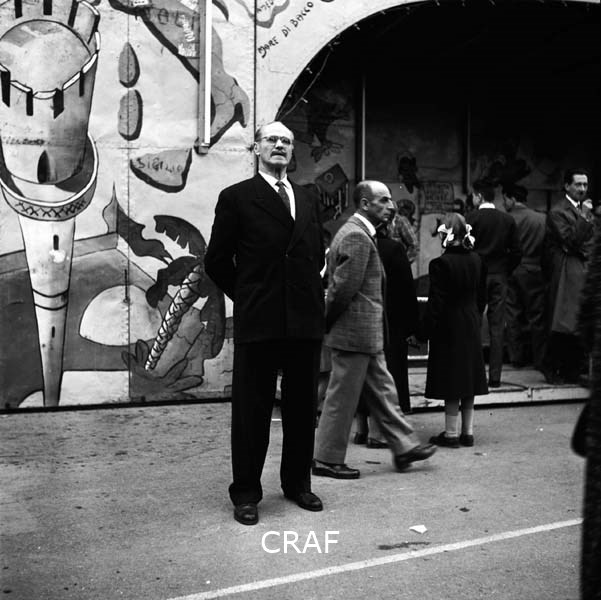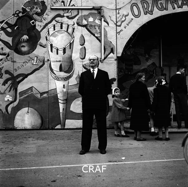 Uomo accanto alla parete di una giostra; sulla destra dell'immagine una passante