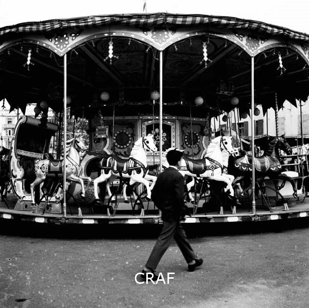 Passante davanti ad una giostra di cavalli