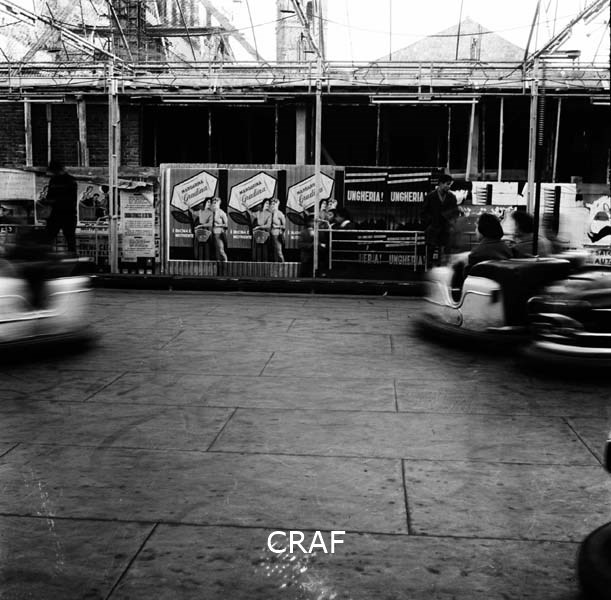 Uomini e fanciulle accanto all'entrata di una giostra