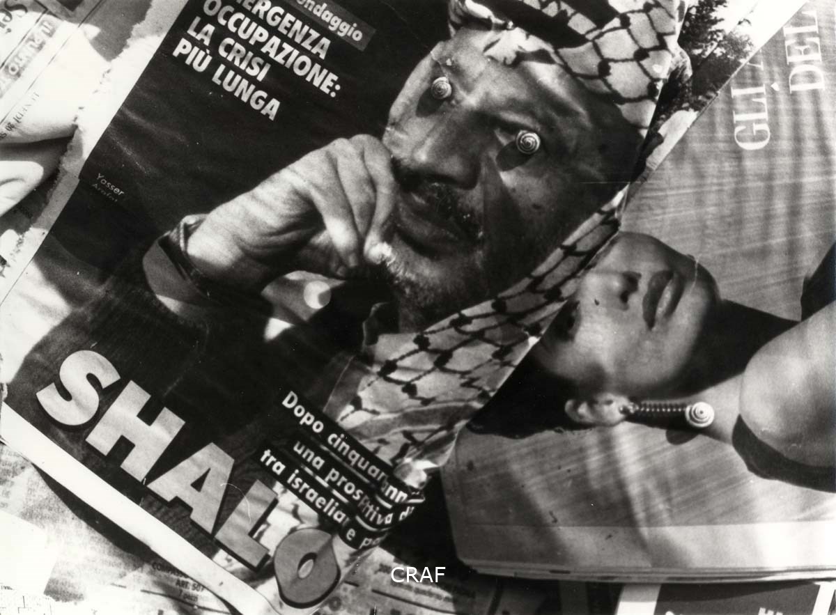 Al centro della fotografia il viso di Jasser Arafat in una rivista; in alto...