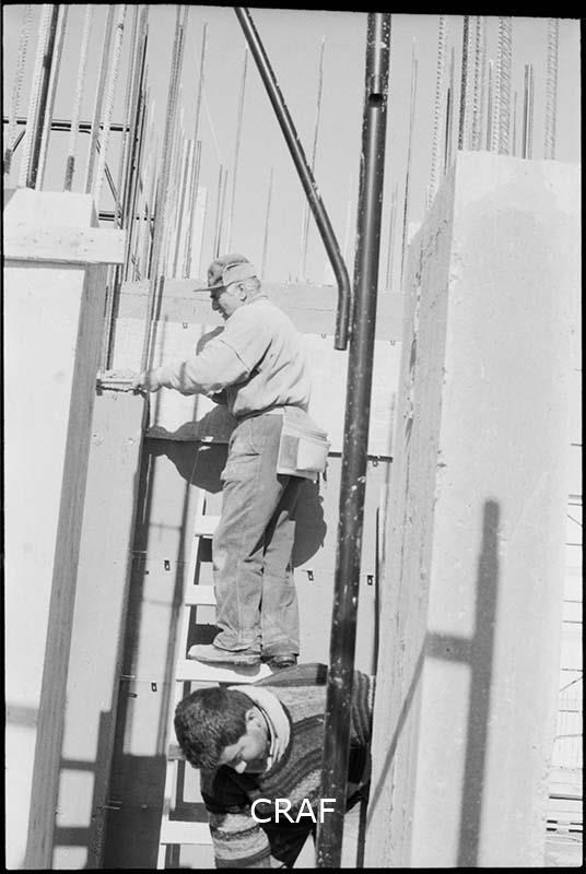 Operai al lavoro sulle strutture in calcestruzzo armato di un cantiere di...