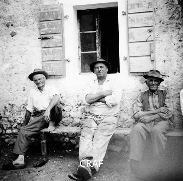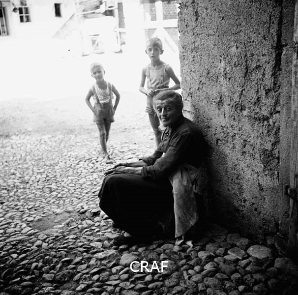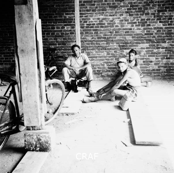 Uomo e due fanciulli seduti accanto a un muro di mattoni e a due biciclette...