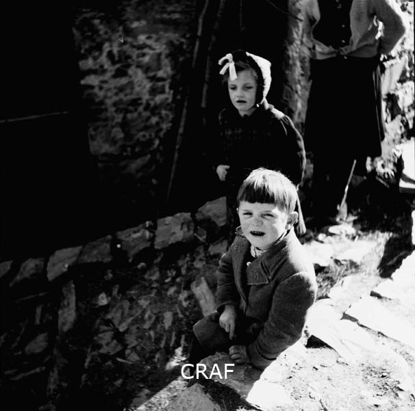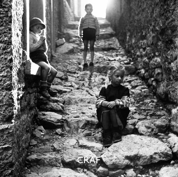 Tre bambini: una bambina seduta sulla scalinata, un bambino seduto su una...