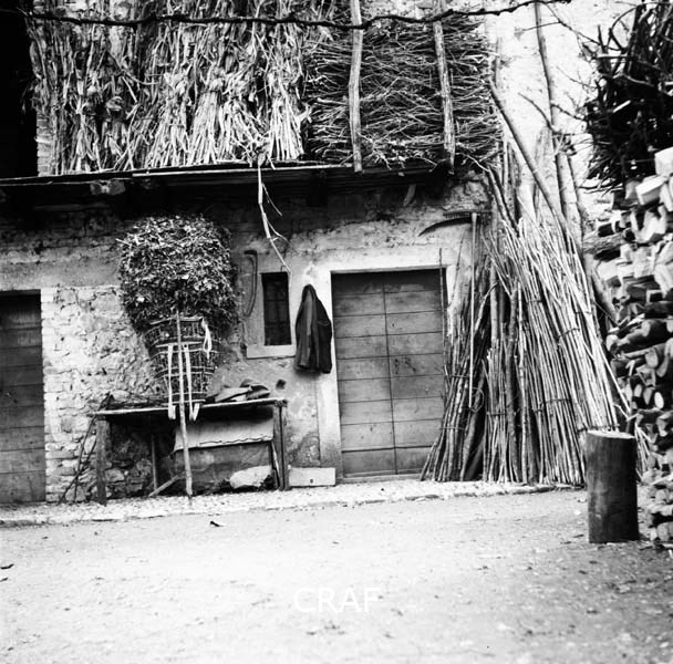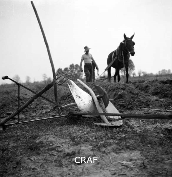 In primo piano attrezzature agricole, sullo sfondo uomini e cavallo