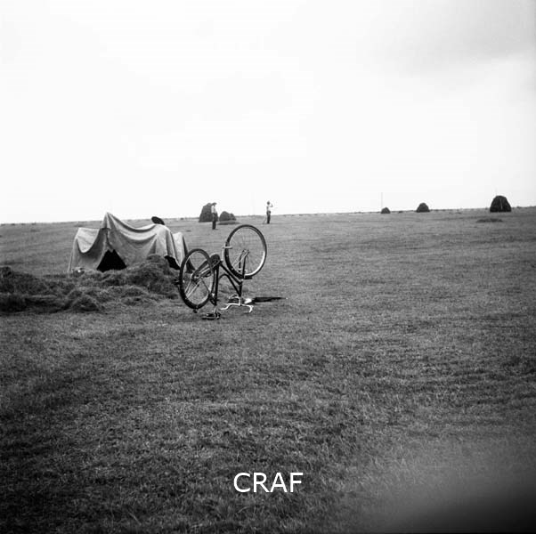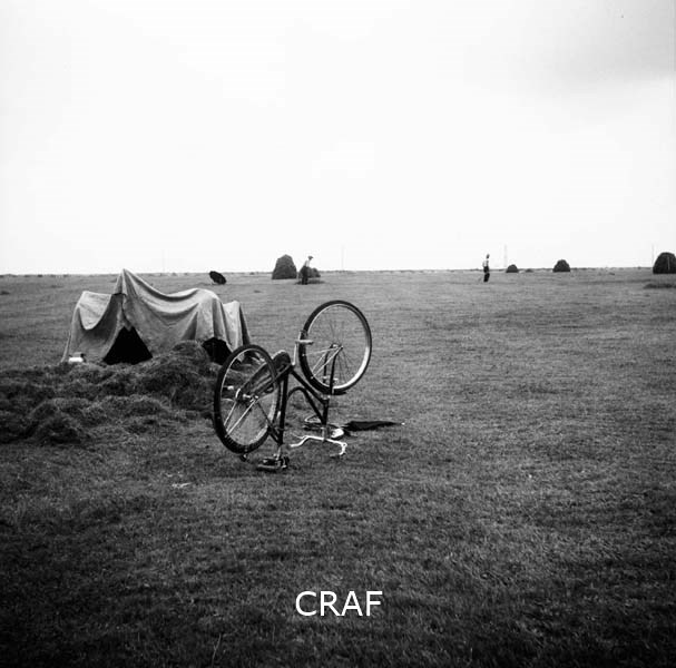 Prato con covoni di fieno, una bicicletta rovesciata, figure umane in lontananza