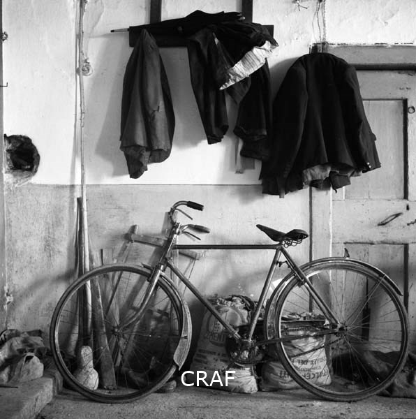Bicicletta appoggiata al muro di una casa accanto a una porta; abiti appesi al...