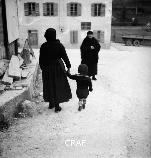 Donna e fanciullo mano nella mano, una seconda donna vista forntalmente; strade...