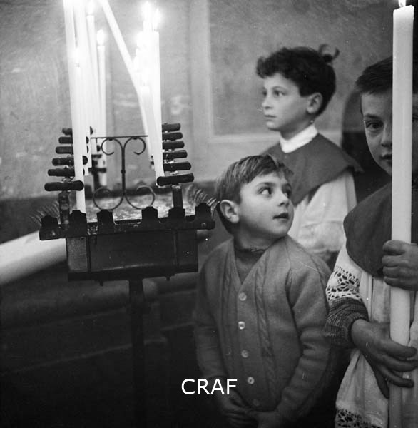 Due fanciulli vestiti da chierichetti e un terzo fanciullo situato tra i primi...