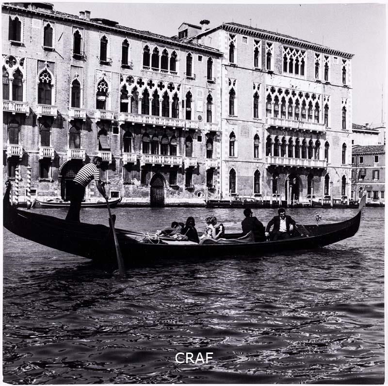 Turisti in gondola sul Canal Grande davanti a Palazzo Giustinian e Ca' Foscari....