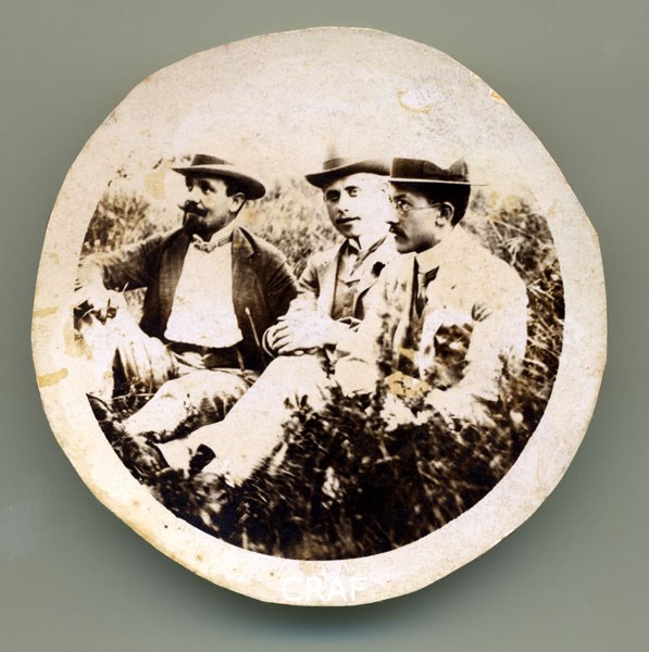 Tre uomini ben vestiti seduti per terra in un prato