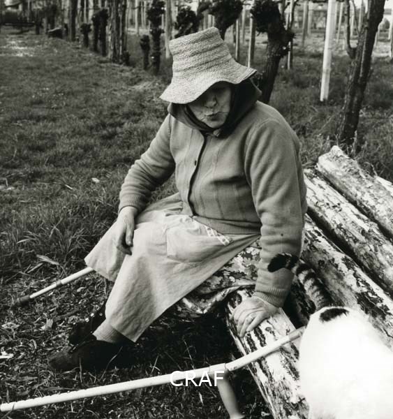 Donna anziana in stampelle con un cappello di paglia seduta su un tronco...