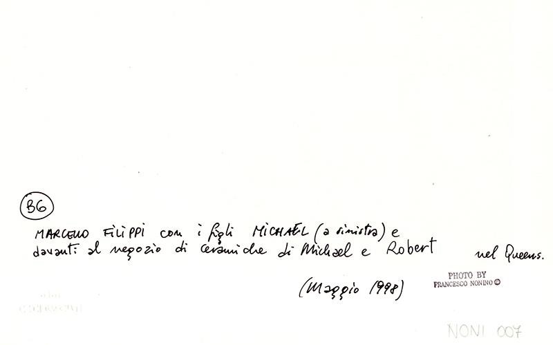 Marcello Filippi con i figli Michael a sinistra e Robert davanti al negozio di ceramiche di Michael e Robert nel Queens.