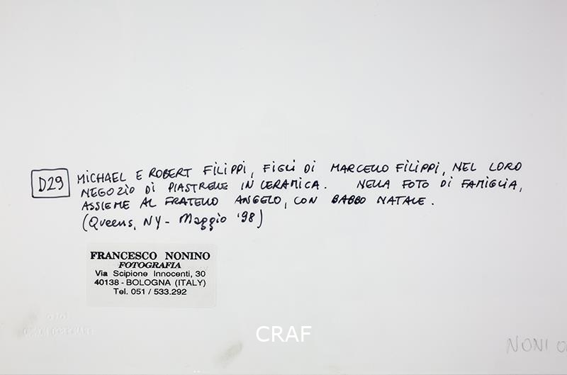 Michael e Robert Filippi, seduti a un tavolo nel loro negozio di piastrelle in ceramica, esibiscono una foto di famiglia con Babbo Natale.