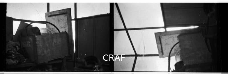 Particolare di una vetrata all'interno di un'officina. Attraverso i vetri polverosi si intravede l'ampio spazio di lavoro. Lo scatto fa parte del progetto "Officina mio incubo", che l'autore realizzò nel 1989.