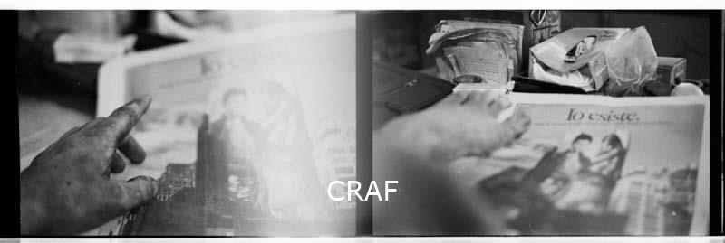 Particolare di una mano maschile con l'indice teso a indicare qualcosa. Sullo sfondo, fuori fuoco, si vede una rivista o un quotidiano. Lo scatto fa parte del progetto "Officina mio incubo", che l'autore realizzò nel 1989.