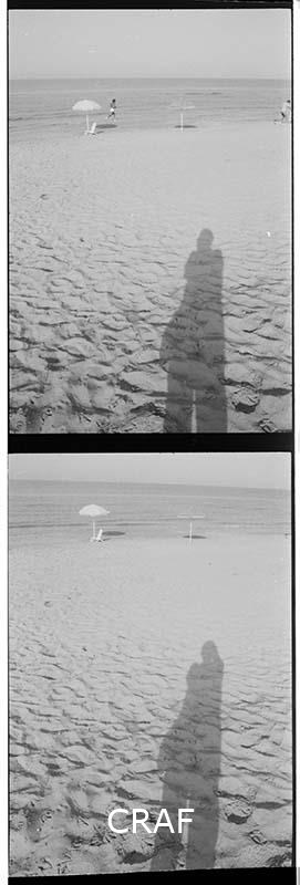 La luce del sole proietta l'ombra del fotografo su una spiaggia deserta. Per confronto con altri negativi, si tratta probabilmente della spiaggia di Torvaianica, frazione del comune di Pomezia (RM).