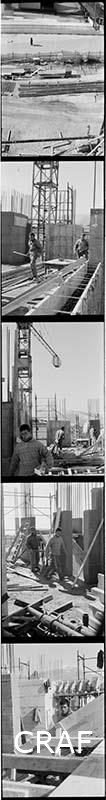 Un operaio al lavoro in un cantiere edile nella periferia nord di Avezzano (AQ). La testa dell'uomo fa capolino tra le strutture in calcestruzzo armato.