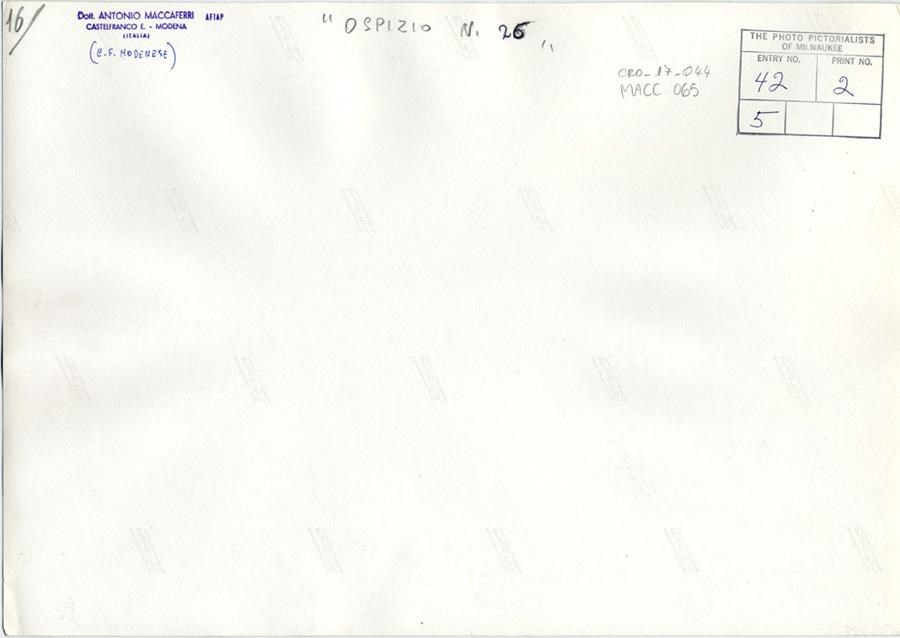 Ospizio. Interno. Mensa? Uomo anziano con cappello chino sulla tavola. Tavola imbandita con piatti bicchieri, bottiglie, pezzi di pane