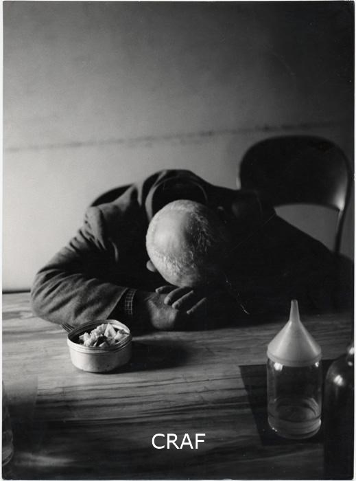 Ospizio. Interno. Primo piano di uomo che dorme con la testa appoggiata adun tavolo. Sul tavolo un recipiente con cibo, due bottiglie e un' imbuto.