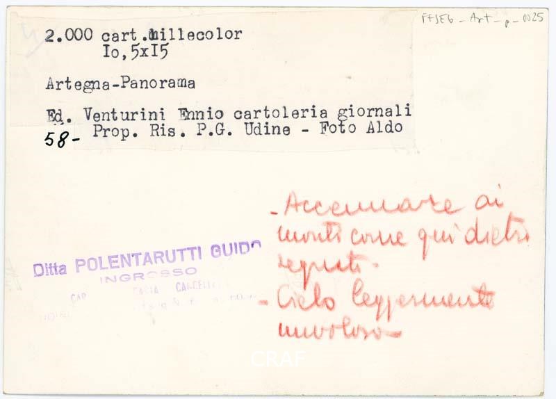 Panorama di Artegna visto da Borgo Mont: il colle san Martino, al centro dell'immagine, si erge sulle case di Artegna. La chiesa parrocchiale di Santa Maria Nascente è al centro dell'immagine, sullo sfondo il castello Savorgnan e il campanile della Chiesa di San Martino.