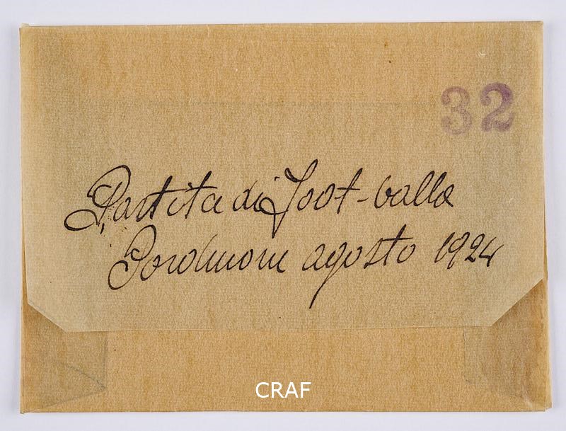 Ripresa da bordo campo di un'azione durante una partita di calcio a Pordenone. È possibile che si tratti di uno scatto che documenta una delle prime partite disputate dal Football Club Pordenone, già Sezione Calcio dello Sport Club Unione, nato con questa denominazione nel 1920 e ribattezzato l'anno dopo. Nel 1922 in città esistevano altre tre formazioni calcistiche: il Club Torre, la società Avvenire di Borgomeduna e l'Associazione Sportiva Pordenone. Fino al 1926 il Football Club Pordenone giocherà le partite in casa sul terreno delle Ex Casermette di Via Antonio Molinari (oggi Palamarmi).