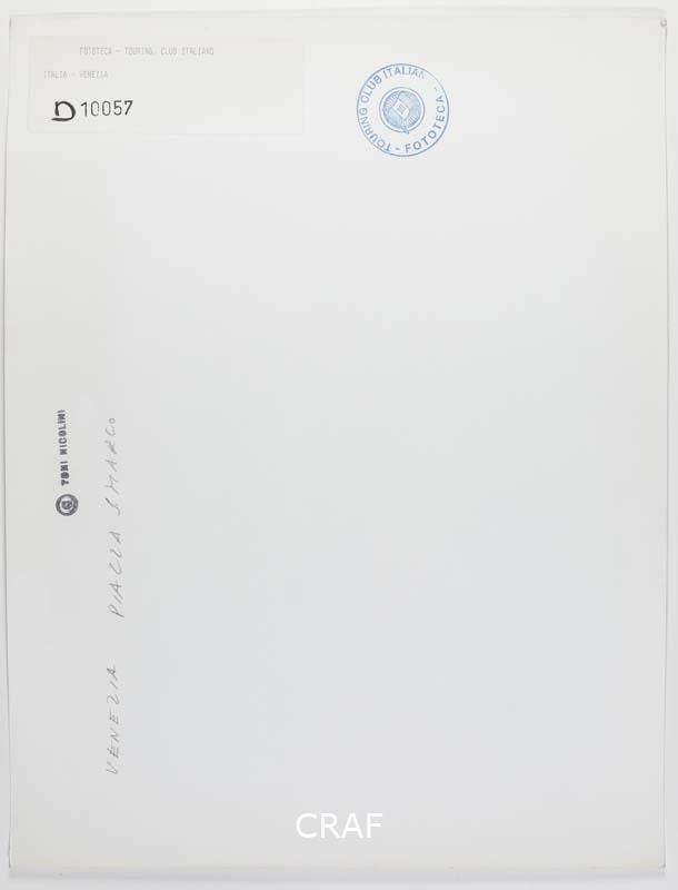 Un frate percorre una passerella in direzione delle Procuratie Vecchie, in una Piazza San Marco invasa dall'acqua alta. Scatto realizzato in occasione della campagna fotografica per il volume Venezia TCI del 1978, ma non pubblicato.