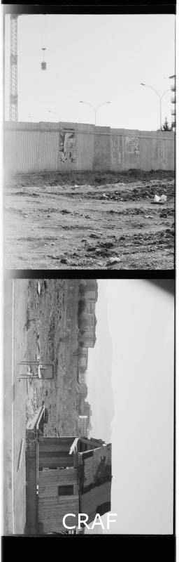 Veduta di una zona di nuova edificazione nella periferia nord di Avezzano (AQ). Una recinzione di pannelli ondulati in lamiera divide lo sterrato in primo piano da un cantiere, riconoscibile dalla gru sulla sinistra.