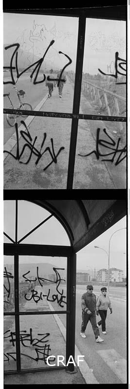 Un uomo e una donna in abiti sportivi ritratti mentre camminano di fianco a una pensilina dei mezzi pubblici lungo una strada della periferia di Avezzano (AQ).