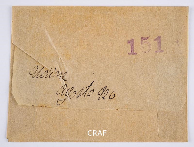 Veduta del terrapieno di Piazza Vittorio Emanuele II a Udine (oggi Piazza Libertà) ripresa dalla Loggia del Lionello verso il Porticato di San Giovanni e la Torre dell'Orologio. In primo piano si osserva la Colonna della Giustizia, a sinistra l'Arco Bollani e la mole del Castello. Sotto il Porticato di San Giovanni, un cantiere, allestito davanti al Pantheon dei Caduti della Grande Guerra, è tappezzato di manifesti pubblicitari.