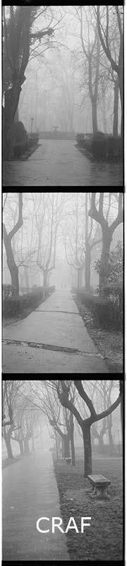 Veduta di uno dei viali pedonali alberati che circondano piazza Torlonia, nel centro storico di Avezzano (AQ), in un giorno di nebbia.