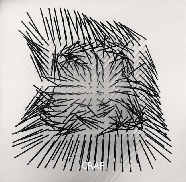 Reticolo di segmenti metallici scuri conficcati in una superficie bianca