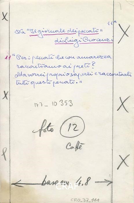 « Per i peccati che con amarezza raccontiamo ai preti? Ma vorrei proprio saperli e raccontarli tutti, questi peccati ». Didascalia riportata sia sul verso del positivo sia in corrispondenza dell'immagine pubblicata nel fotoracconto dal titolo "Il giornale dei peccati" in Venerdì Il Caffè Politico Letterario mensile di attualità n. 2 febbraio 1955.
