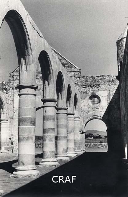 ruderi, architettura, navate, pilastri, archi, campanile, frontone