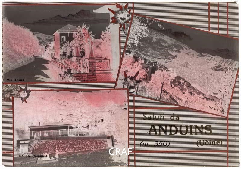 Fotocomposizione con tre immagini di Anduins: le scuole comunali, una via e un panorama sono disposte in senso orario fra disegni di stelle alpine e le didascalie.