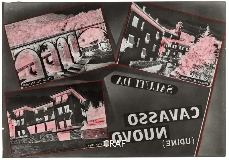 Riproduzione di una fotocomposizione con didascalia e tre immagini di Cavasso: piazza Vittorio Emanuele II, già piazza del Municipio, il ponte Maraldi tra Cavasso e Meduno e il bar alimentari gestito da Rolando Bier.