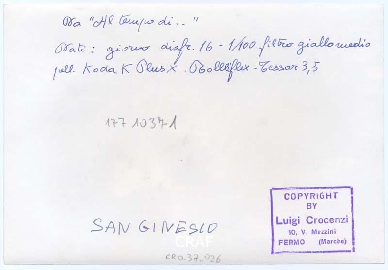 Veduta urbana di San Ginesio (MC) e delle campagne circostanti. Al centro dello scatto si riconosce la chiesa di San Gregorio. Immagine appartenente agli scatti del romanzo fotografico dal titolo "Al tempo di..." a cui Crocenzi lavorò a partire dal 1954 ma che non fu mai pubblicato. Alcune delle immagini che Crocenzi scattò per questo romanzo fotografico furono pubblicate in più puntate su Venerdì Il Caffè mensile di attualità negli anni compresi tra il 1954 e il 1955 (n.9 del 1954; nn.2-3-4 del 1955) con il titolo "Il giornale dei peccati".