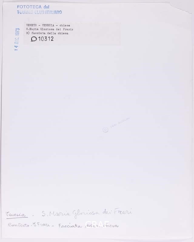 La facciata della basilica di Santa Maria Gloriosa dei Frari ripresa dall'omonima fondamenta. Scatto realizzato in occasione della campagna fotografica per il volume Abbazie e conventi TCI del 1973, ma in quell’occasione non pubblicato.