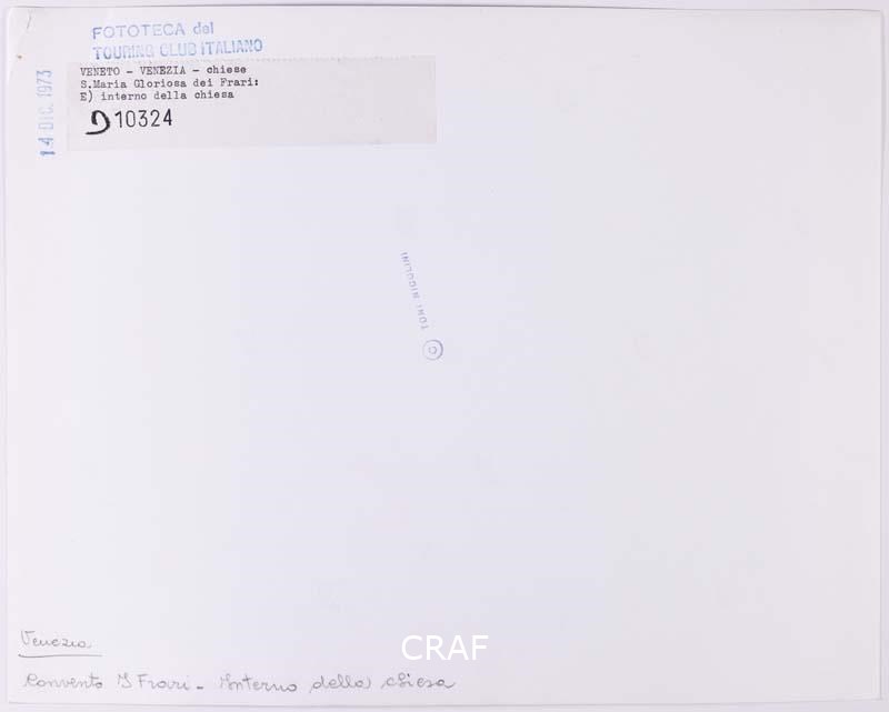 Il braccio destro del transetto della basilica di Santa Maria Gloriosa dei Frari, con l'ingresso alla sagrestia. Si vedono i monumenti a Jacopo Marcello, Benedetto Pesaro, Paolo Savelli e al beato Pacifico. Scatto realizzato in occasione della campagna fotografica per il volume Abbazie e conventi TCI del 1973, ma in quell’occasione non pubblicato.