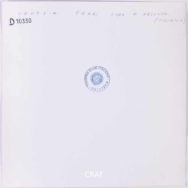 Il setto marmoreo che separa il coro dalla navata centrale nella basilica di Santa Maria Gloriosa dei Frari. Attraverso il portale ad arco si intravede l'Assunta del Tiziano. Scatto realizzato in occasione della campagna fotografica per il volume Abbazie e conventi TCI del 1973, ma in quell’occasione non pubblicato.