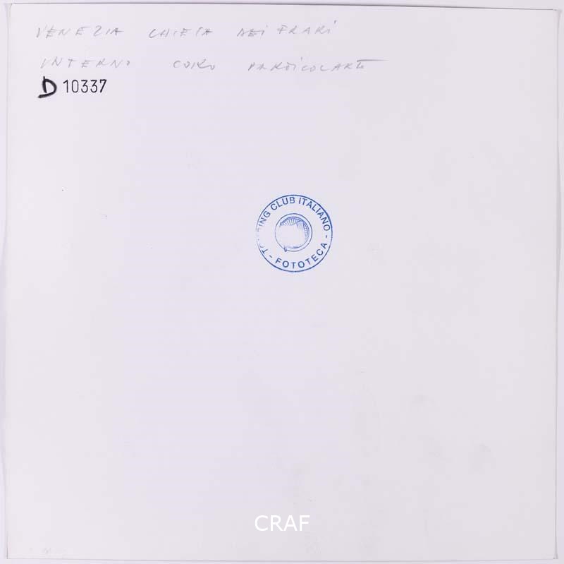 Gli stalli lignei del monumentale coro della basilica di Santa Maria Gloriosa dei Frari. Scatto realizzato in occasione della campagna fotografica per il volume Abbazie e conventi TCI del 1973, ma in quell’occasione non pubblicato.