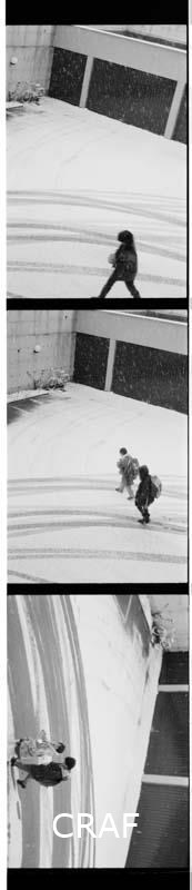Scorcio dell'area dei box auto del condominio "Le Rondini" nella zona nord di Avezzano (AQ) durante una nevicata. Il passaggio di alcune automobili ha lasciato delle scie curvilinee sul sottile strato di neve che copre l'asfalto. Due bambini attraversano la scena. Sullo sfondo una bicicletta è appoggiata al muro.