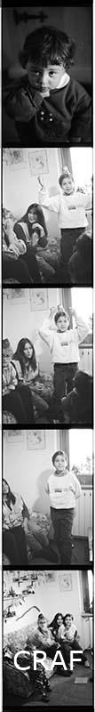 Ritratto di una bambina in un interno, ripreso dall'alto verso il basso.