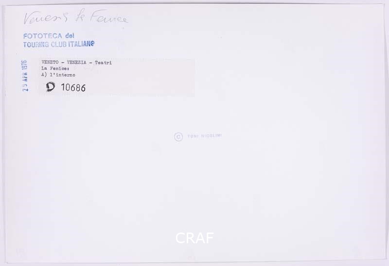 La sala teatrale della Fenice visto dal palcoscenico. Scatto realizzato in occasione della campagna fotografica per il volume Teatri e scenografie TCI del 1976, ma in quell’occasione non pubblicato.
