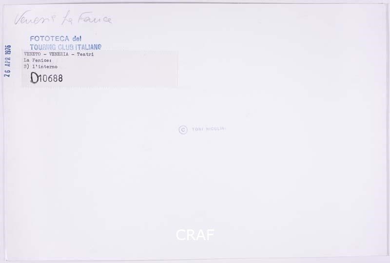 La sala teatrale della Fenice vista dalla platea. Scatto realizzato in occasione della campagna fotografica per il volume Teatri e scenografie TCI del 1976, ma in quell’occasione non pubblicato.