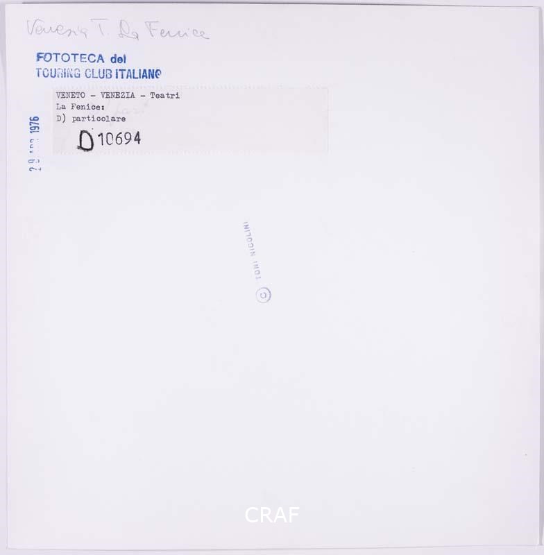 Particolare della macchina scenica del teatro La Fenice. Scatto realizzato in occasione della campagna fotografica per il volume Teatri e scenografie TCI del 1976, ma non pubblicato.